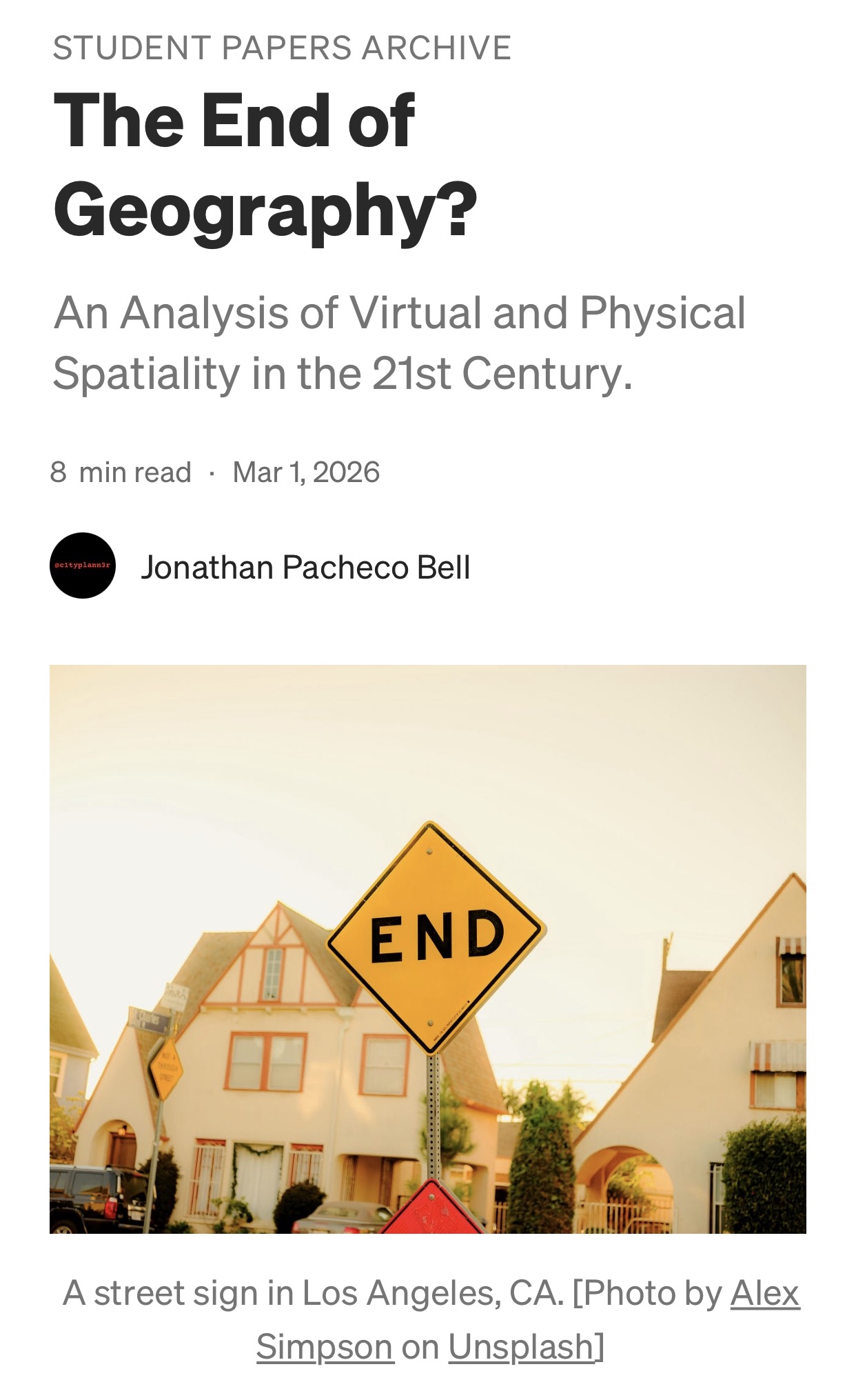 Originally written in 2004 and revised in 2026, my piece “The End of Geography?” is published on Medium. I consider claims alleging geography’s demise in the context of territorial space versus cyberspace. This is the latest contribution to my Student Papers Archive.