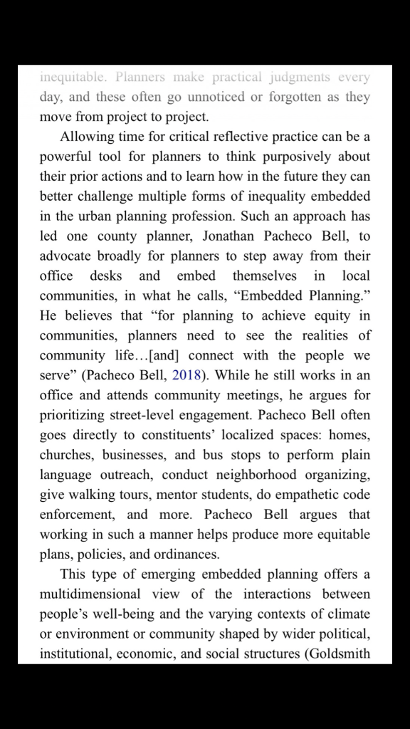 “Allowing time for critical reflective practice can be a powerful tool for planners to think purposively about their prior actions and to learn how in the future they can better challenge multiple forms of inequality embedded in the urban planning profession. Such an approach has led one county planner, Jonathan Pacheco Bell, to advocate broadly for planners to step away from their office desks and embed themselves in local communities, in what he calls, “Embedded Planning.” He believes that “for planning to achieve equity in communities, planners need to see the realities of community life…[and] connect with the people we serve” (Pacheco Bell, 2018). While he still works in an office and attends community meetings, he argues for prioritizing street-level engagement. Pacheco Bell often goes directly to constituents’ localized spaces: homes, churches, businesses, and bus stops to perform plain language outreach, conduct neighborhood organizing, give walking tours, mentor students, do empathetic code enforcement, and more. Pacheco Bell argues that working in such a manner helps produce more equitable plans, policies, and ordinances.