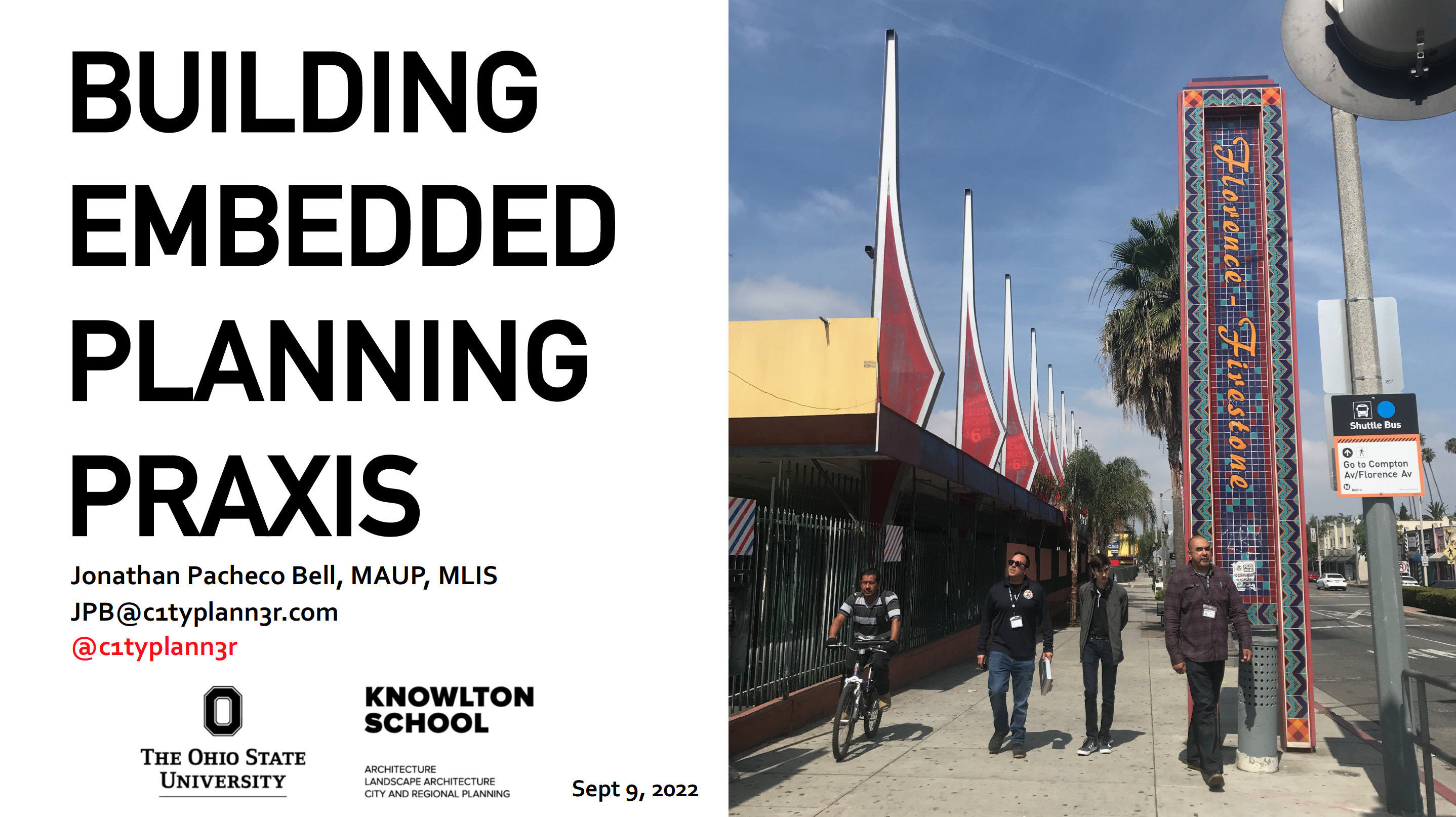 Today I presented virtually on the origins of #EmbeddedPlanning praxis in Gala Korniyenko’s course, “Reading the City Through History & Law” at The Ohio State University, Knowlton School City & Regional Planning.