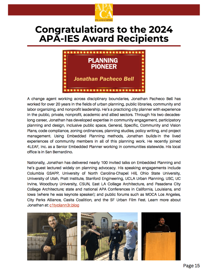 Thank you to my APA Inland Empire Section colleagues for the Planning Pioneer Award 2024. It’s humbling to receive this recognition among the many planners out there putting in work.