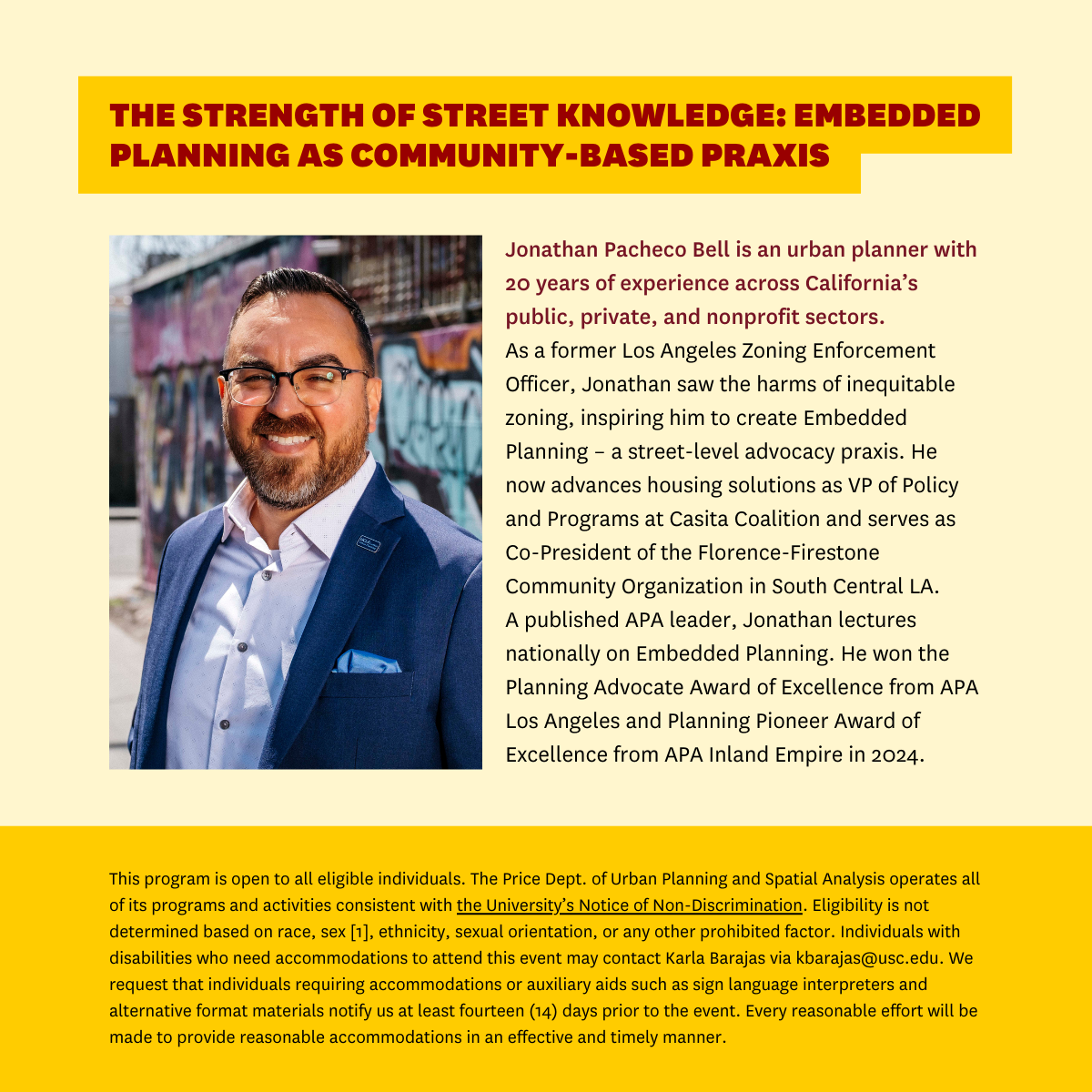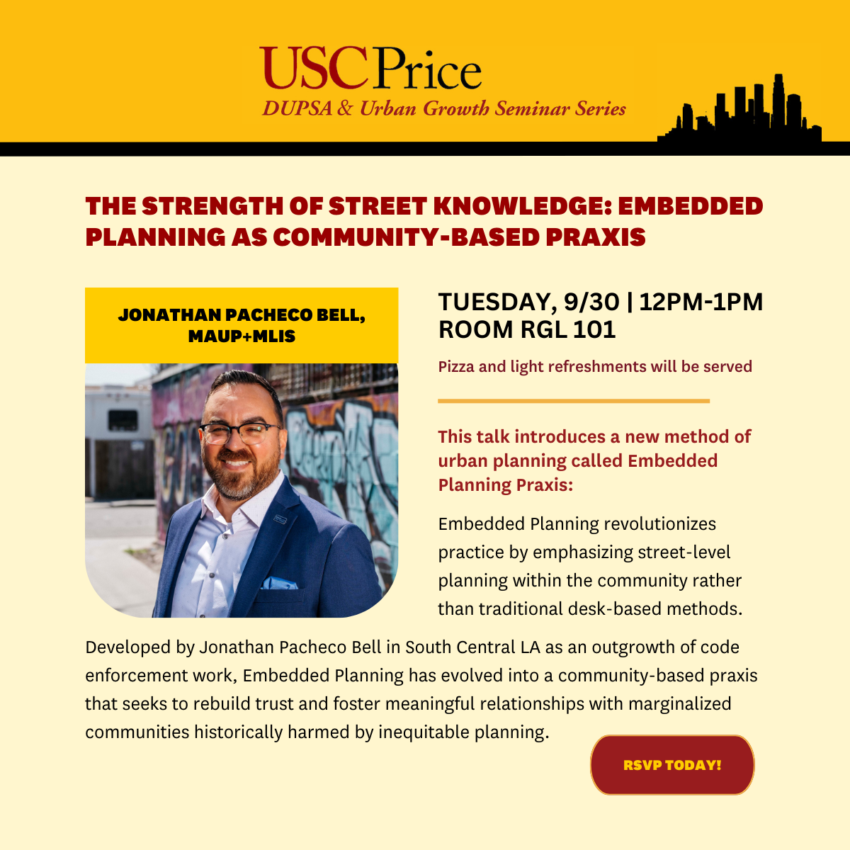 The Strength of Street Knowledge: Embedded Planning as Community-Based Praxis at USC Price Sep 28 2025 This is the next chapter of the Embedded Planning story. Share this: Click to email a link to a friend (Opens in new window) Email Click to print (Opens in new window) Print Like Loading... Published by Jonathan Pacheco Bell, MAUP, MLIS Creator of Embedded Planning and @C1TYPLANN3R View all posts by Jonathan Pacheco Bell, MAUP, MLIS