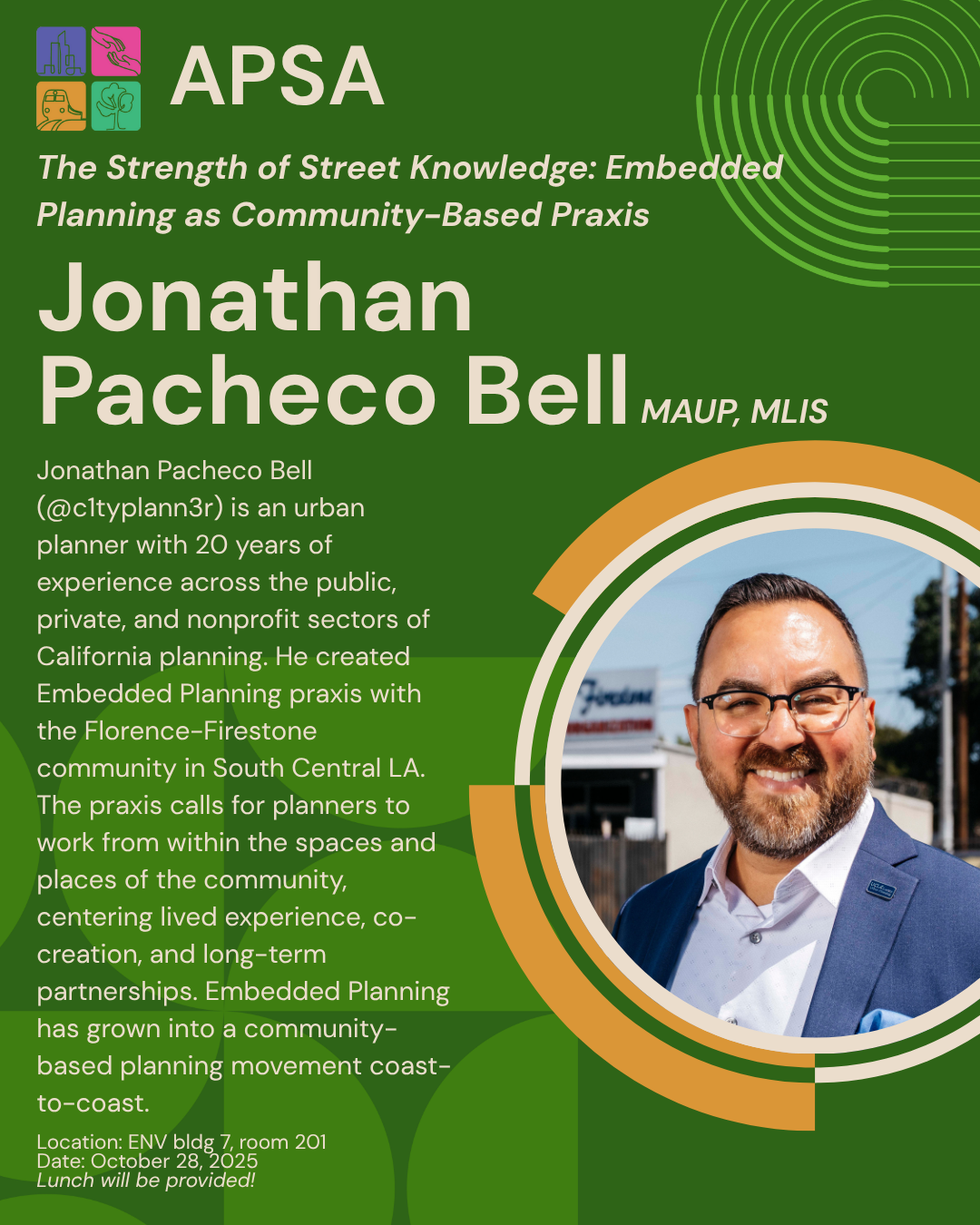 Jonathan currently serves as Co-President of the nonprofit Florence-Firestone Community Organization, in the neighborhood where Embedded Planning was born. From 2021 to 2025, he was an Adjunct Professor in the Department of Urban and Regional Planning at Cal Poly Pomona and remains a mentor to emerging Bronco Planners.