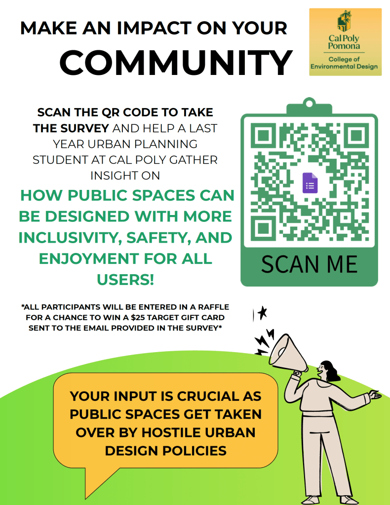 Planners + Community: Zena Al-Beitawi is doing an urban planning senior project examining how public spaces can be designed for inclusivity, safety, and enjoyment versus Hostile Architecture in Pomona, CA.