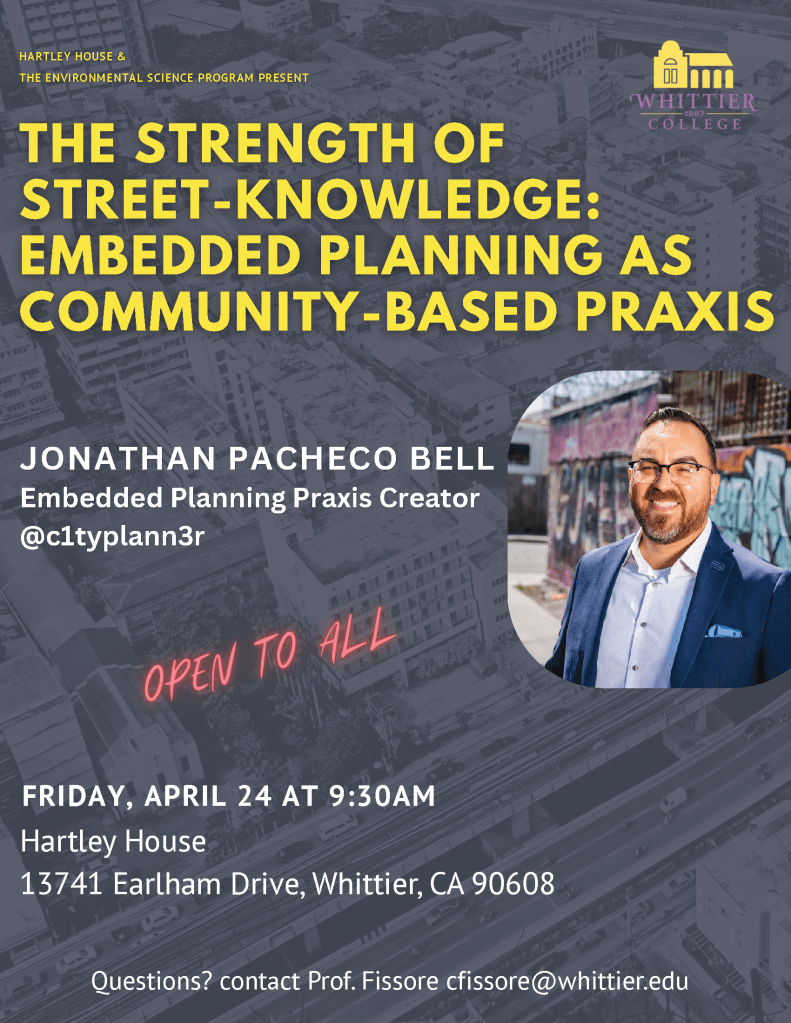 This talk introduces a new method of urban planning called Embedded Planning Praxis. Embedded Planning revolutionizes practice by emphasizing street-level planning within the community rather than traditional desk-based methods. Developed by Jonathan Pacheco Bell in South Central LA as an outgrowth of code enforcement work, Embedded Planning has evolved into a community-based praxis that seeks to rebuild trust and foster meaningful relationships with marginalized communities historically harmed by inequitable planning.