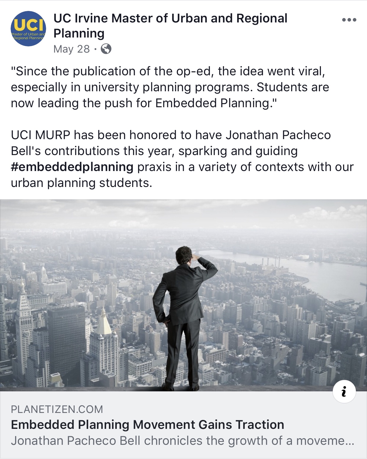 Among the many excellent urban planning programs in the Los Angeles region, UCI MURP has been one of the strongest supporters of advancing #EmbeddedPlanning praxis. To the students, faculty, and staff: THANK YOU!