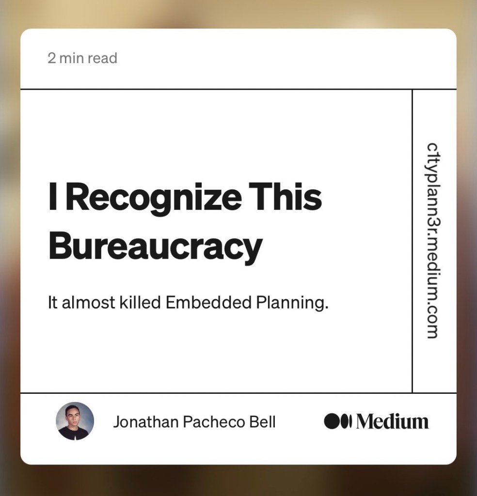 Los Angeles-based urban planner Jonathan Pacheco Bell urges practitioners to consider Embedded Planning praxis. Developed by Bell on the ground in South Central LA, Embedded Planning is a way to fundamentally restructure community engagement and practice. Embedded Planning means planning from the street, not from a desk. Embedded Planners work in the spaces and places of community members, building bridges with marginalized communities harmed by inequitable planning. Embedded Planning is a #praxis that puts theory into action to better this world.