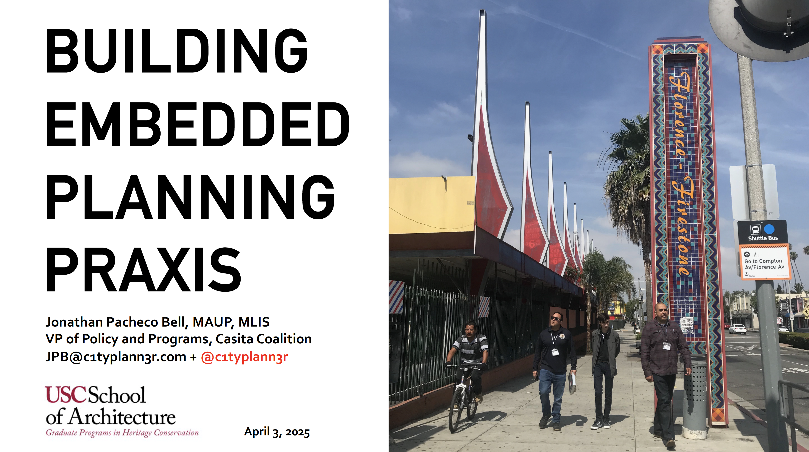 Scenes from USC Architecture from my 4/3 guest talk, “Building Embedded Planning Praxis.” The invited lecture was delivered in the USC Master of Heritage Conservation graduate course, Heritage Conservation Policy and Planning.